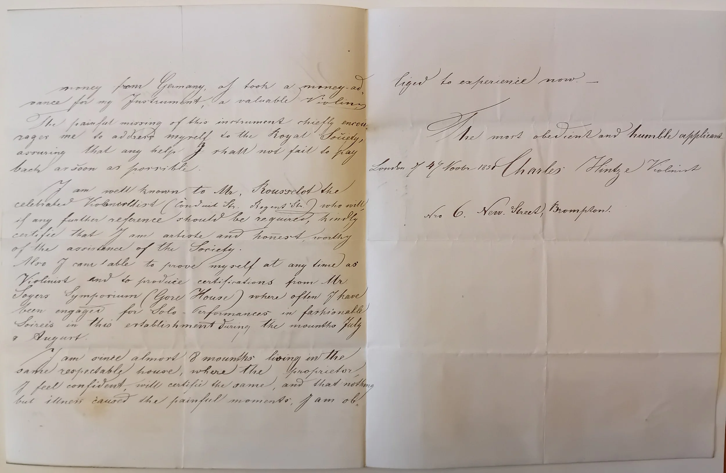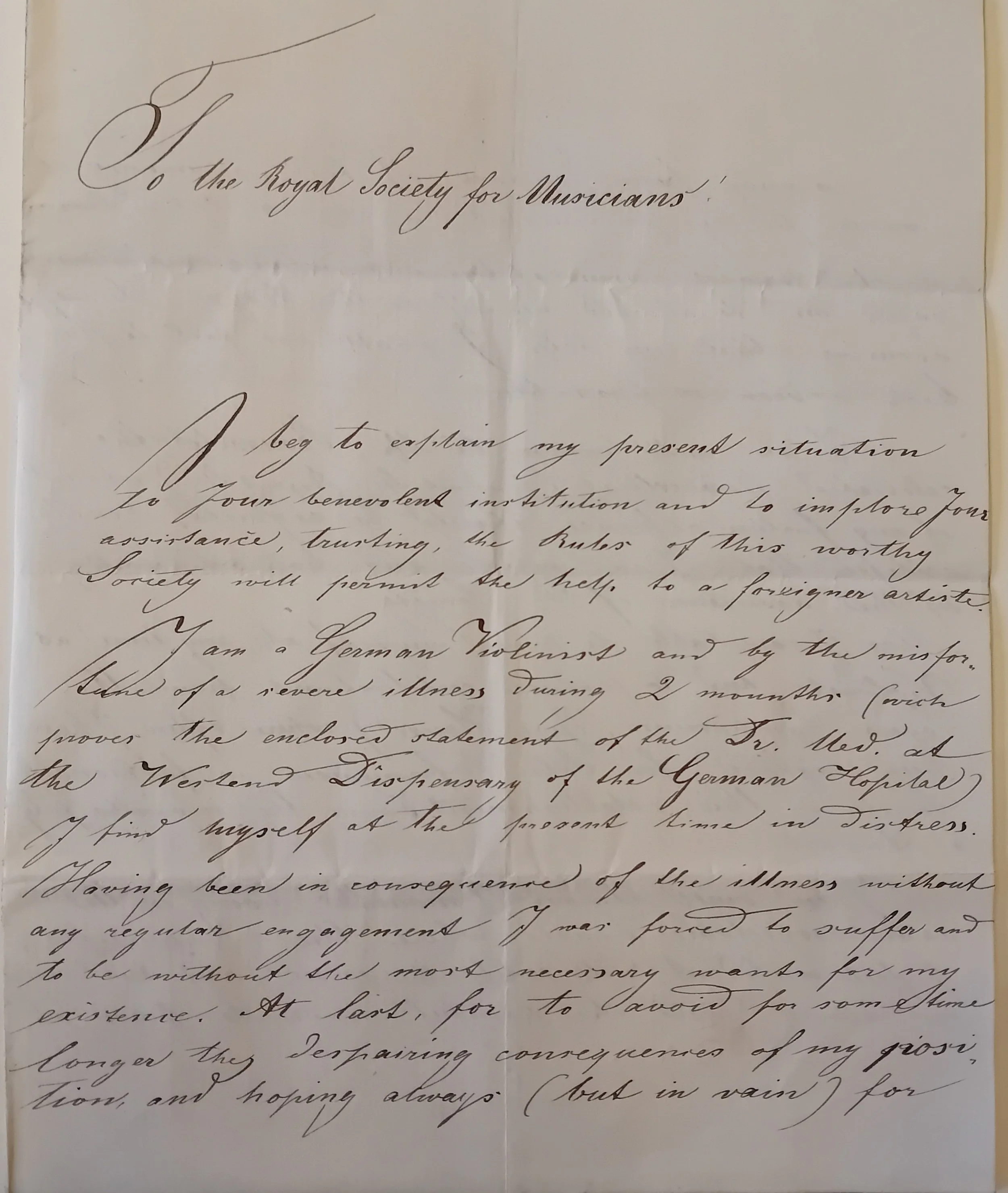 This note was found in files of correspondence from 1851, and was attached to a request for support from a self-described “foreigner artiste” Charles (Carl) Hintze. Carl had recently arrived from Germany, seeking new employment opportunities in London; he references performing at ‘fashionable soirées’ at Gore House, a restaurant run by the French chef Alexis Soyer (1810-1858), and also that the musician Scipion Rousselot (1804-ca 1880), the cellist in the Beethoven Quartet Society at this period, would also vouch for him. Hintze was tragically struck down with illness shortly after his arrival. Although not a member of RSM, he was recommended by acquaintances to apply to the Society for financial aid. As with many similar requests, Hintze proactively sought a doctor’s note to confirm invalidity, to better help his case.