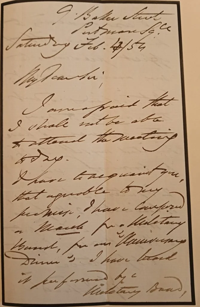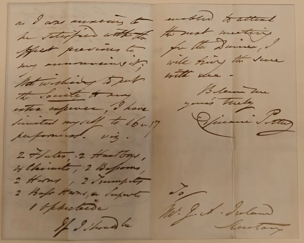 On 4 February 1854, writing from Baker Street, Potter wrote to the Society’s Secretary offering a March for the Anniversary Dinner that year. The letter shows Potter’s careful, and charming, sense of occasion whereby he writes that he has “limited myself to 16 of 17 performers” due to “not wishing to put the Society to any extra expense”.