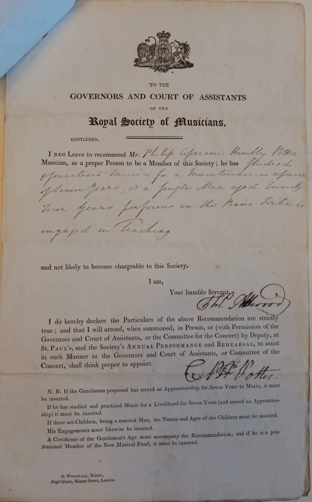 Potter studied counterpoint with Thomas Attwood (1765-1838, Member A126) who was to endorse his application for RSM Membership in 1817.